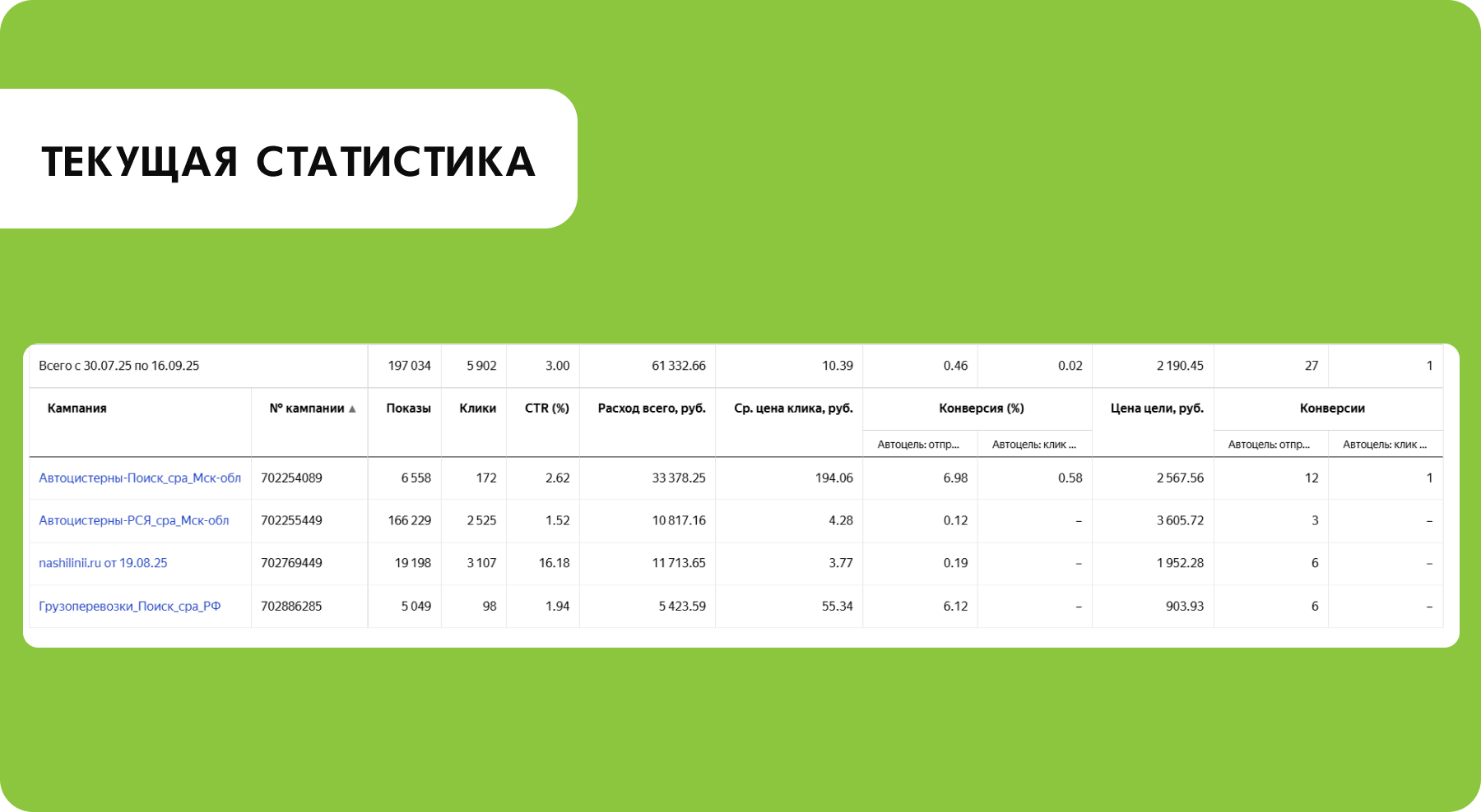 Нужно было получить хоть какие-то реальные конверсии по услуге при бюджете не более 10 000 рублей в неделю. В дальнейшем, если реклама покажет эффективность, клиент планировал расширять размещение на другие услуги грузоперевозок.