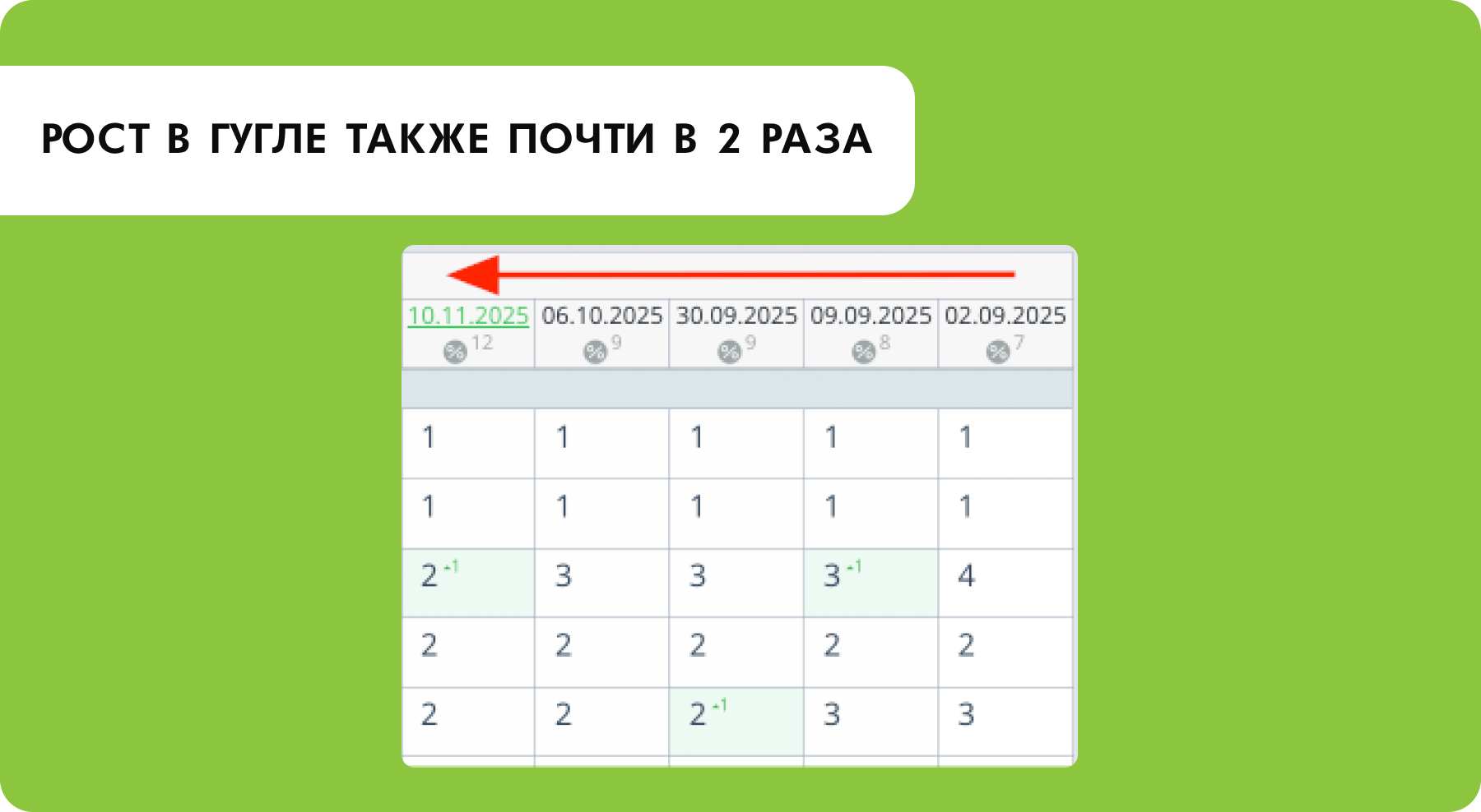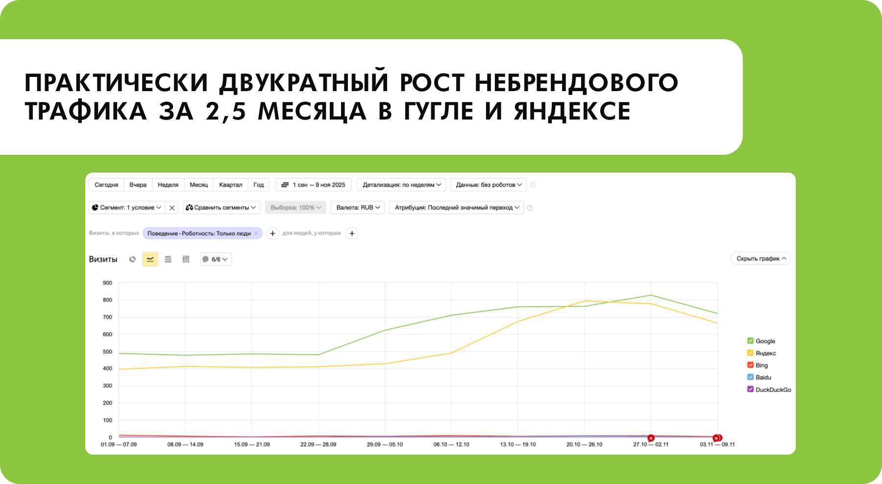 Практически двукратный рост небрендового трафика за 2,5 месяца в Гугле и Яндексе.