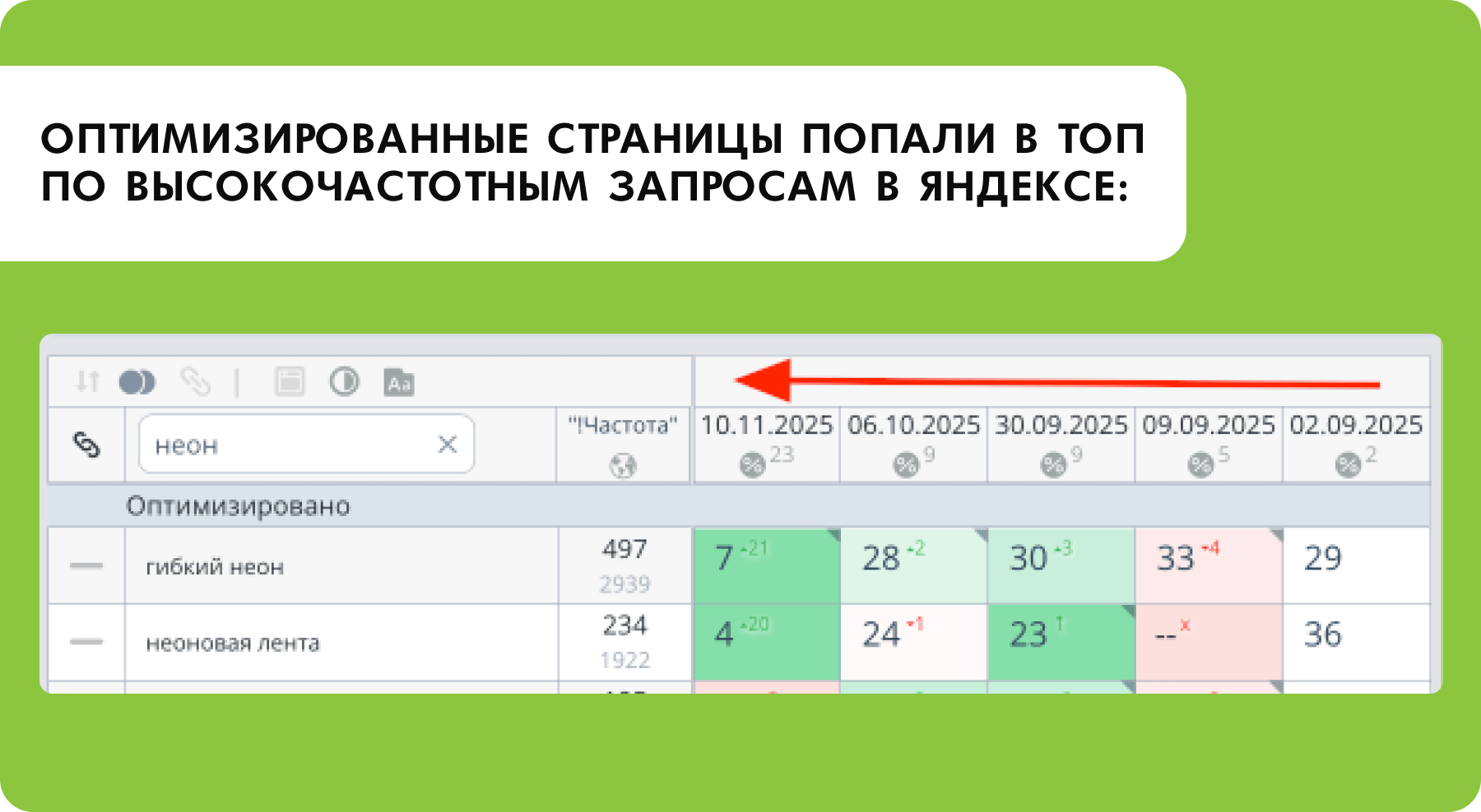 1. Оптимизированные страницы попали в топ по высокочастотным запросам в Яндексе: