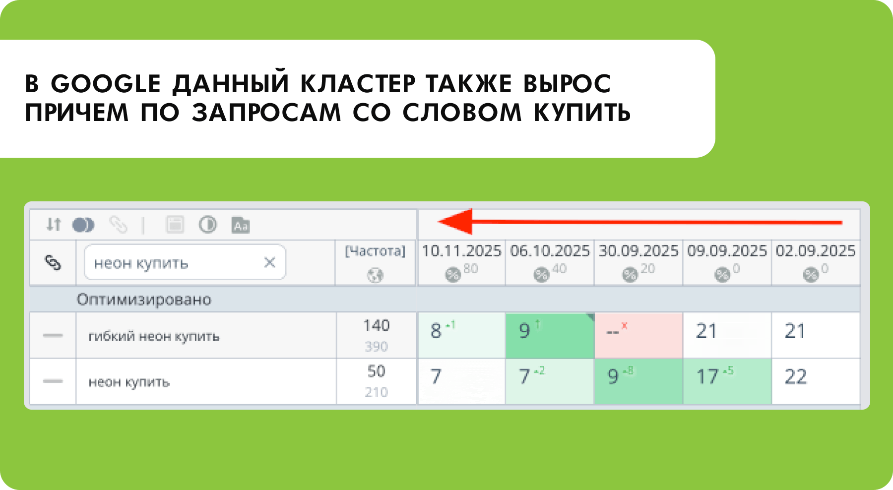 2. В Google данный кластер также вырос — причем по запросам со словом купить