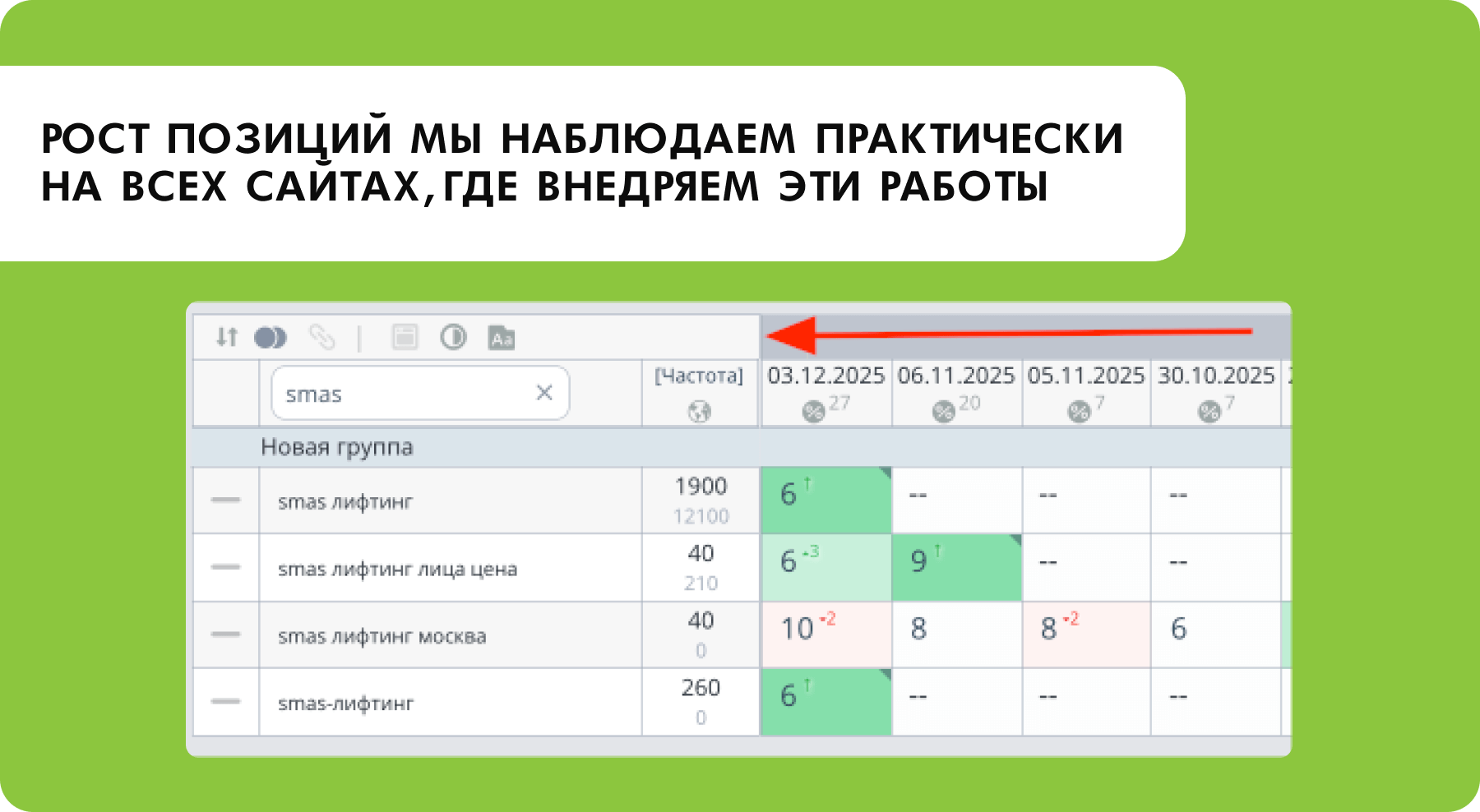 Естественно, что на одном сайте эти результаты были бы не показательными. Рост позиций мы наблюдаем практически на всех сайтах, где внедряем эти работы. Ещё пример: