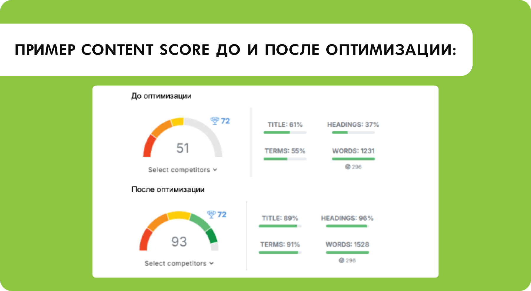 Борьба за Content Score: Мы ставим задачу редактору довести показатель Score минимум до 65 баллов (при среднем у конкурентов, например, 60).