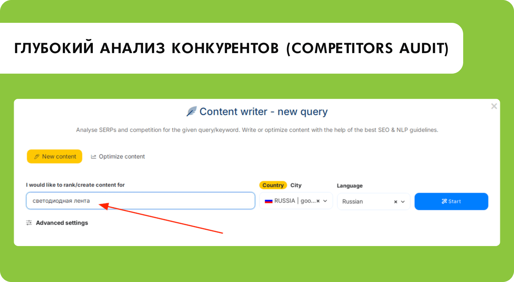 Всё начинается в интерфейсе NeuronWriter. Мы вводим наше основное ключевое слово, например, светодиодная лента, и выбираем регион.