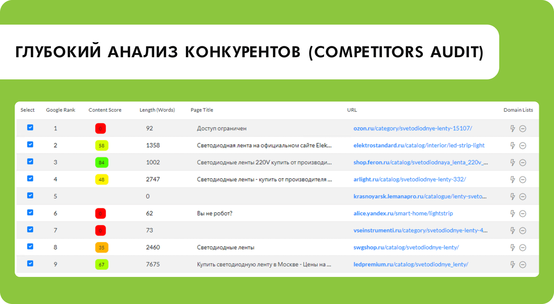 Объективный анализ. Инструмент сканирует страницы конкурентов из ТОП-10 по конкретному запросу и составляет список всех значимых слов и фраз, которые они используют.