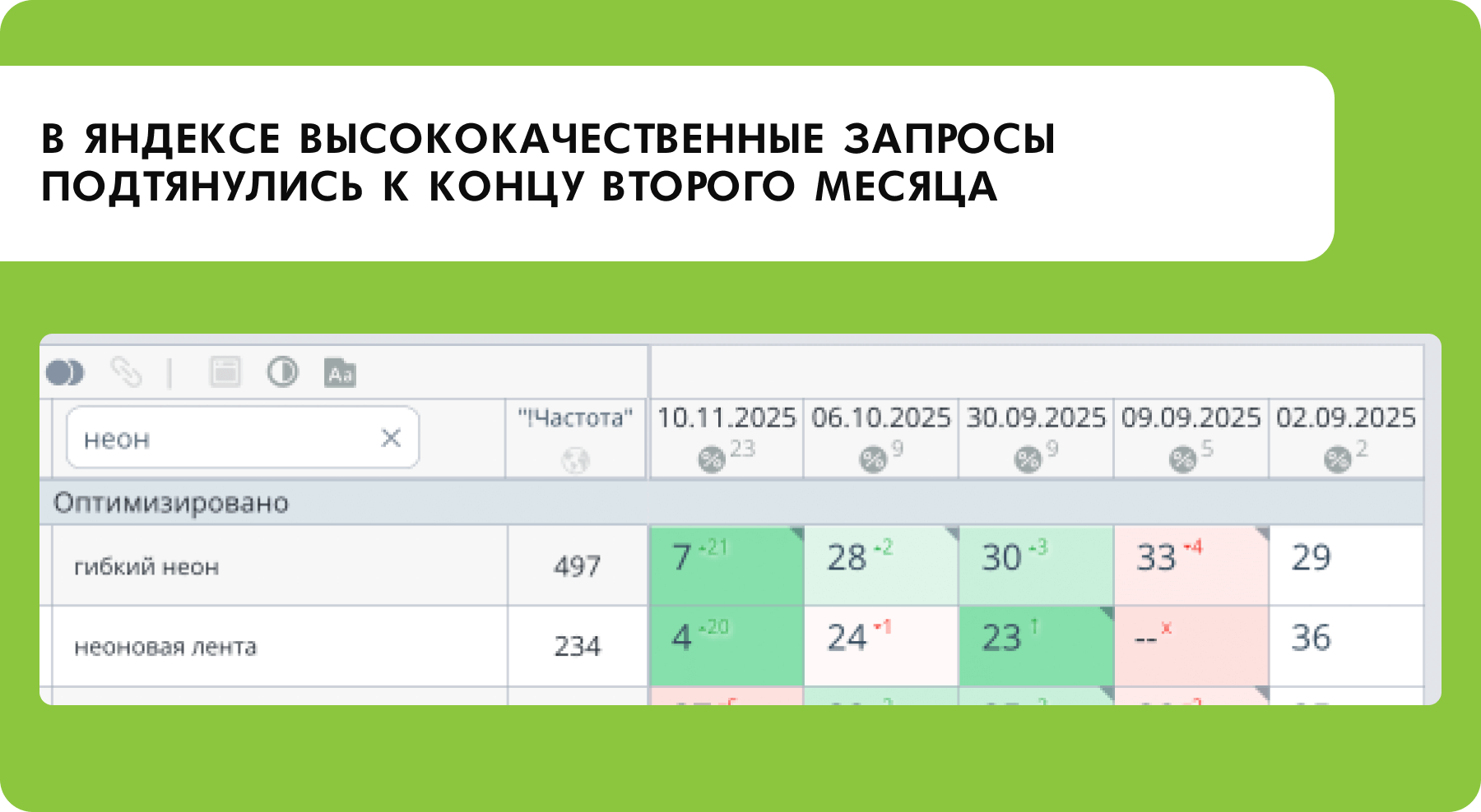 Благодаря LSI-оптимизации мы начали ранжироваться по огромному хвосту запросов. Нейросеть добавила в текст синонимы и околотематические фразы, и люди начали находить нас по ним.